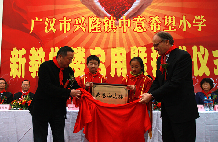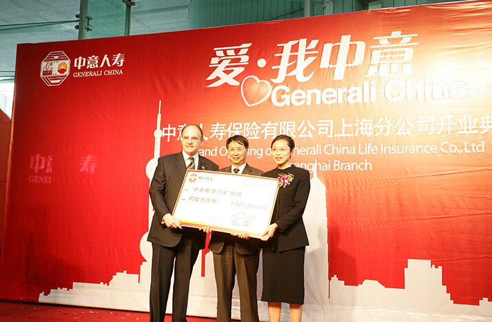 2008年"5.12大地震"發(fā)生后僅兩日,中意人壽即決定以公司名義向中國紅十字會捐款30萬元,幫助災區(qū)同胞度過難關(guān)。此外,中意人壽員工也積極響應,紛紛慷慨解囊,向中國紅十字會捐款21萬余元。后中意人壽又以公司名義捐款50萬元,通過四川省青少年發(fā)展基金會于2009年在四川省廣漢市興隆鎮(zhèn)建設"中意希望小學",幫助四川地震災區(qū)的孩子們重返校園。