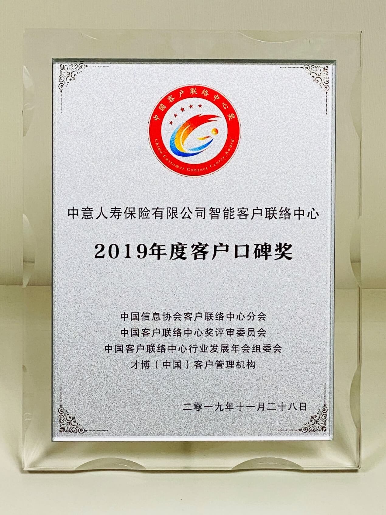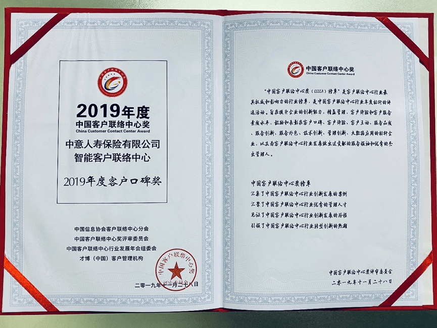 【新聞】中意人壽智能客戶聯(lián)絡(luò)中心榮獲“2019年度客戶口碑獎”