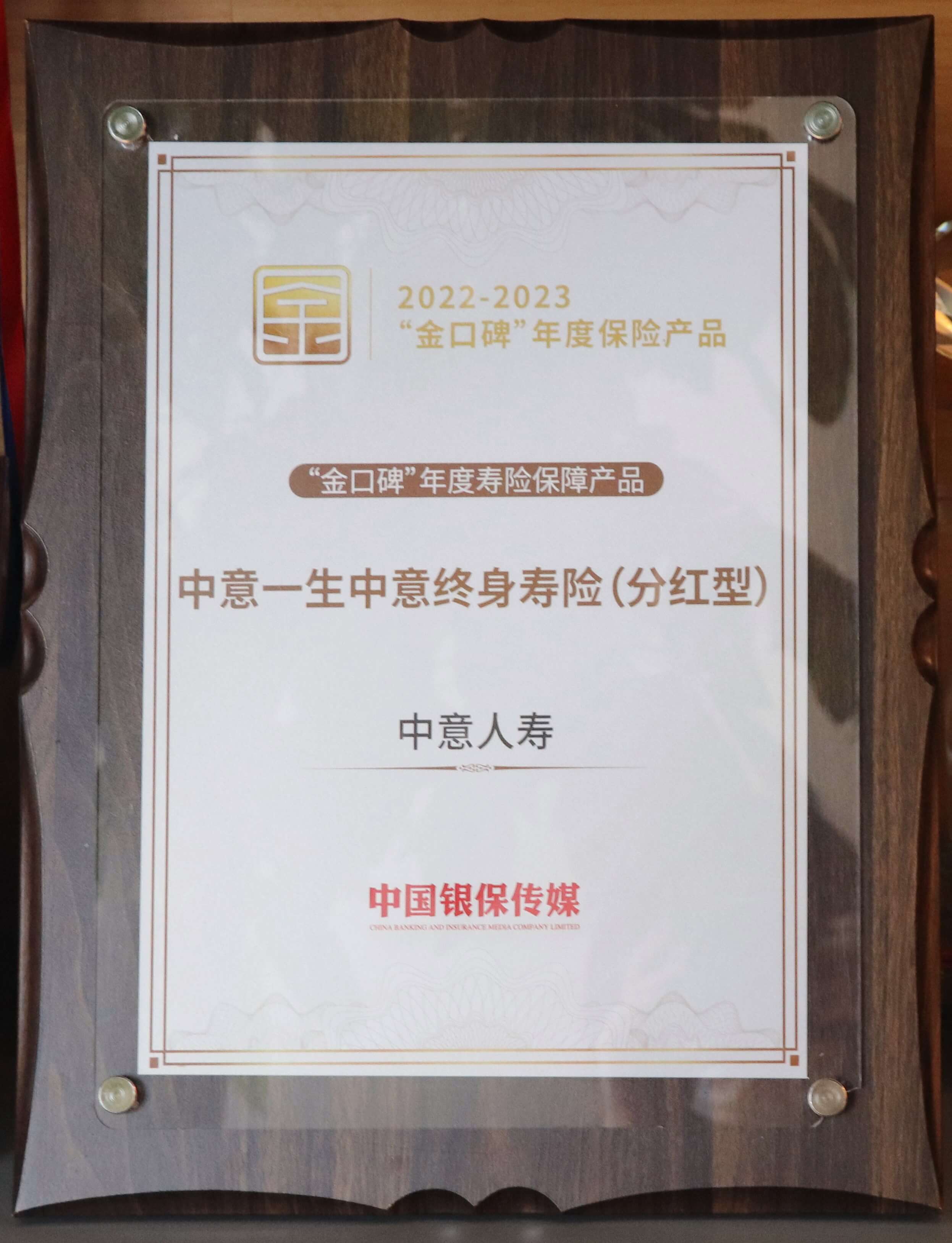 近日,由《中國(guó)銀行保險(xiǎn)報(bào)》主辦的“守正與突圍——首屆“金口碑”保險(xiǎn)產(chǎn)品創(chuàng)新大會(huì)”在上海舉行。會(huì)上發(fā)布了2022-2023“金口碑”年度保險(xiǎn)產(chǎn)品入選名單,中意人壽保險(xiǎn)有限公司推出的“中意一生中意終身壽險(xiǎn)(分紅型)”(以下簡(jiǎn)稱“一生中意”),憑借可滿足消費(fèi)者對(duì)人身保障和家庭資產(chǎn)配置多重需求的產(chǎn)品優(yōu)勢(shì),獲評(píng)“金口碑”年度壽險(xiǎn)保障產(chǎn)品。